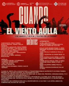 El domingo 1 de marzo a las 19:00 horas, el Teatro de la Ciudad será el escenario de “Cuando el viento aúlla. Danza para la transformación”, una propuesta escénica dirigida por Erika Torres, miembro del Sistema Nacional de Creadores.