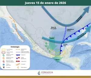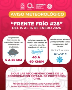 El Frente Frío 28 se aproxima a la Península de Yucatán y generará condiciones climáticas severas en Quintana Roo. Según un aviso importante publicado en las redes sociales de la Coordinación Estatal de Protección Civil (COEPROC), el fenómeno originará un evento de “Norte” a partir del jueves 15 de enero. La masa de aire frío asociada producirá vientos del noroeste y norte con rachas de 40 a 60 km/h, principalmente en las zonas costeras del estado.