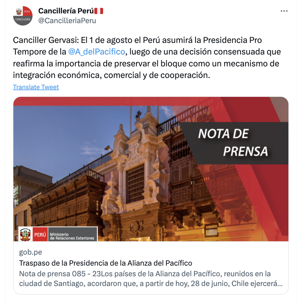 “En declaraciones a la prensa, el Ministro de Relaciones Exteriores de Chile, Alberto van Klaveren, ha dado cuenta de los acuerdos alcanzados, señalando que el 1 de agosto de 2023, el Perú asumirá la Presidencia pro tempore de la Alianza del Pacífico”, señaló la Cancillería peruana.