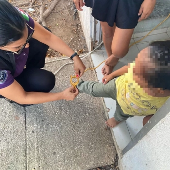 Según vecinos, a la niña la mantenian amarrada por las tardes, mientras que su mamá hace limpieza, ya que supuestamente se sale de la casa y para evitar un accidente la sujetan del pie con una soga.