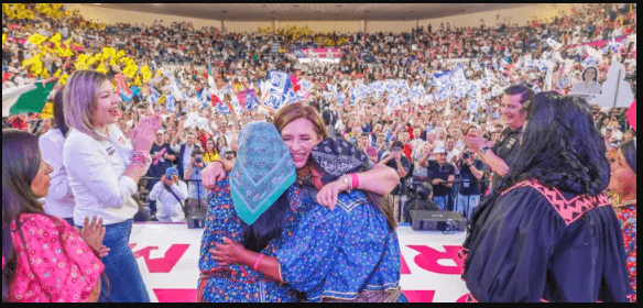 Durante el evento, en el que miles de simpatizantes ovacionaron a Gálvez Ruiz y agitaron sus banderas del PAN, PRI y PRD, un grupo de jóvenes desplegó una lona con la leyenda: “Joven, o votas bien o nos lleva la sheingada”.