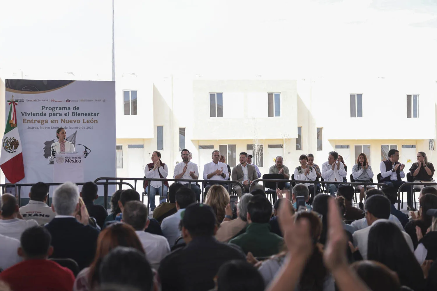 El acto contó con una nutrida presencia del gabinete de vivienda federal. Acompañaron a Sheinbaum el gobernador Samuel García Sepúlveda; la secretaria de Sedatu, Edna Elena Vega Rangel; y los directores generales de Infonavit, Octavio Romero; Conavi, Rodrigo Chávez; e Insus, Víctor Rubén Guzmán, así como la vocal ejecutiva de Fovissste, Jabnely Maldonado.