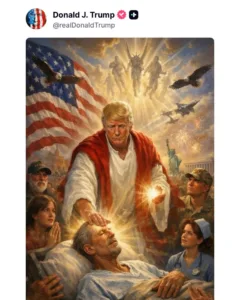 La imagen fue compartida en la plataforma Truth Social y mostraba al mandatario vestido con una túnica blanca y roja mientras colocaba la mano sobre una persona aparentemente enferma, en una escena que recordaba representaciones tradicionales de Cristo realizando milagros.