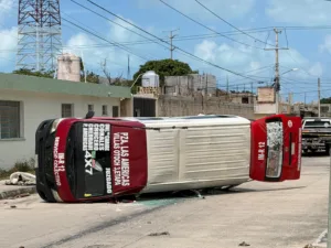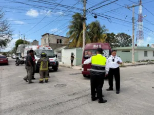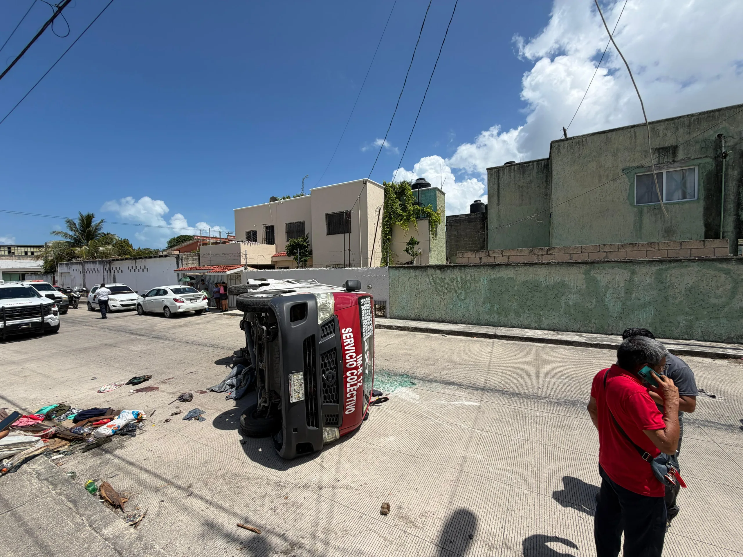 El percance ocurrió en el cruce de las calles 63 y 42, donde dos combis de una concesionaria de Isla Mujeres impactaron de manera violenta, provocando que una de las unidades terminara volcada, en una escena que movilizó a cuerpos de emergencia y generó alarma entre vecinos y automovilistas.